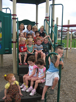 Here is a snap shot of their friends at the park. The red head little girl in front is an official party crasher. She was playing at the park during the party so had to join in on the games and pictures. Too funny!